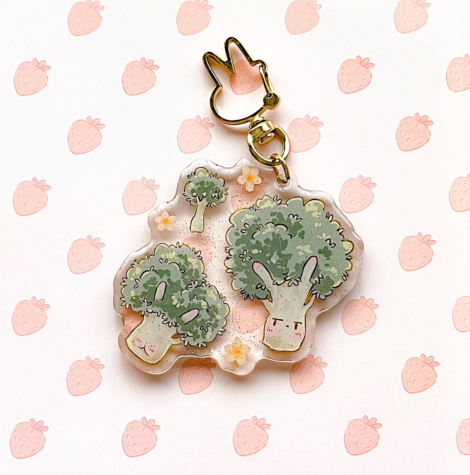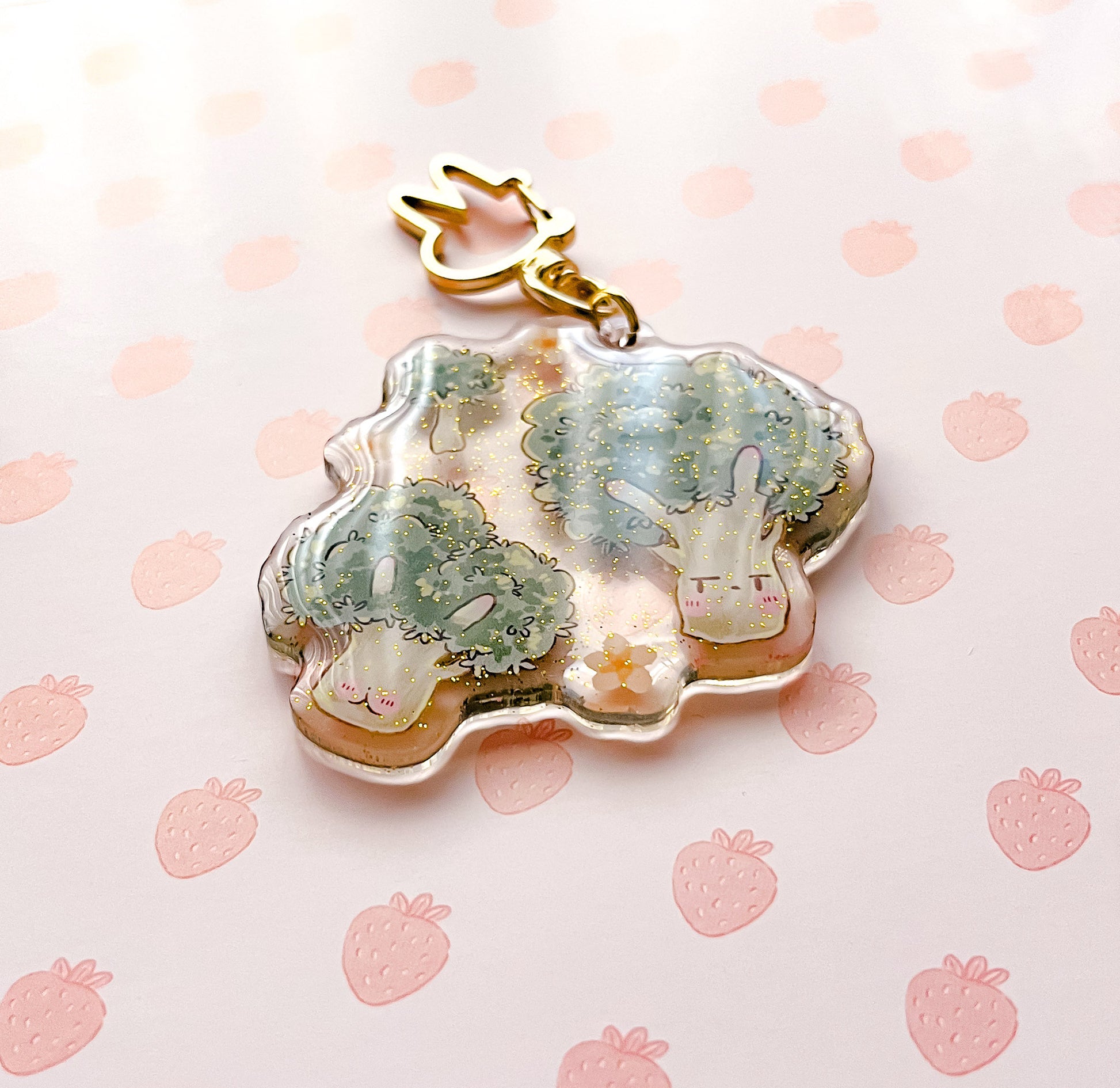 Double sided acrylic keychain. Each keychain comes with a soft gold bunny shaped fixing that opens with a tension clip hinge. The keychain also includes glitter and an epoxy coating on both sides.