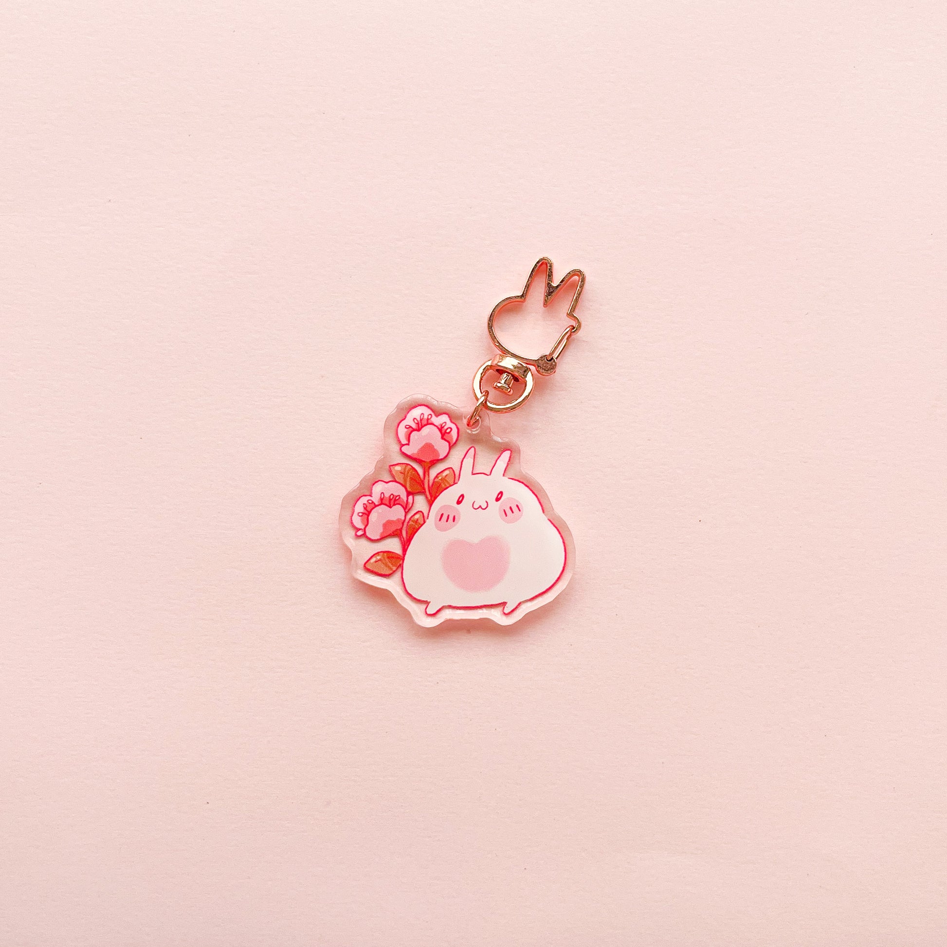 Double sided acrylic keychain. Each keychain comes with a rose gold bunny shaped fixing that opens with a tension clip hinge. The keychain also in epoxy coating on both sides.
