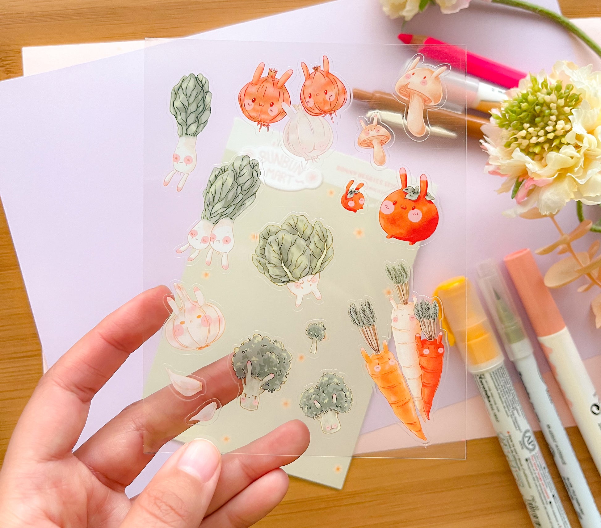 Veggie buns themed waterproof transparent sticker sheet with glossy finish. For daily use in your journaling, planning or decorating your phone, notebook or even your walls ✨✨