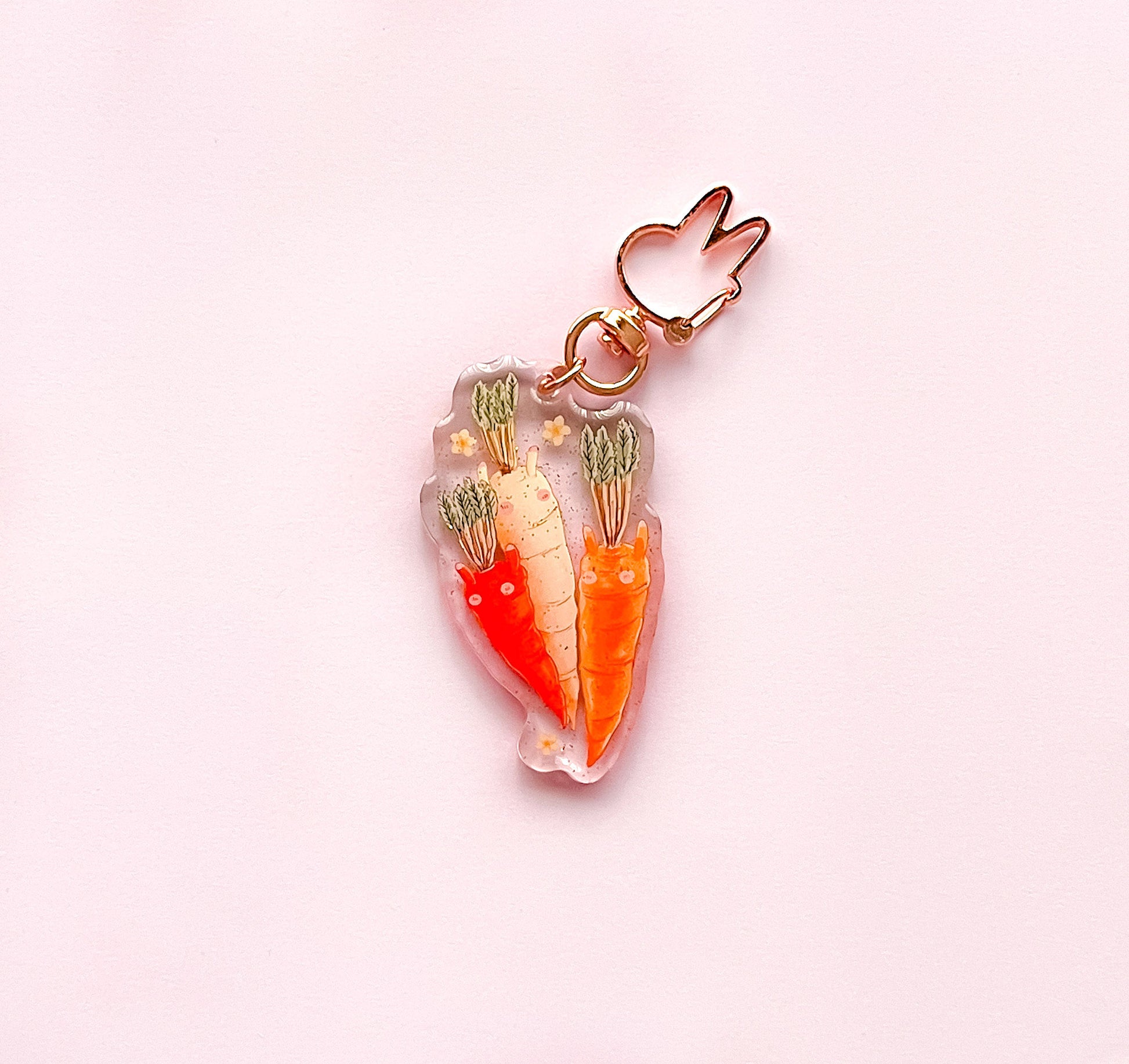 Double sided acrylic keychain. Each keychain comes with a rose gold bunny shaped fixing that opens with a tension clip hinge. The keychain also includes glitter and an epoxy coating on both sides.