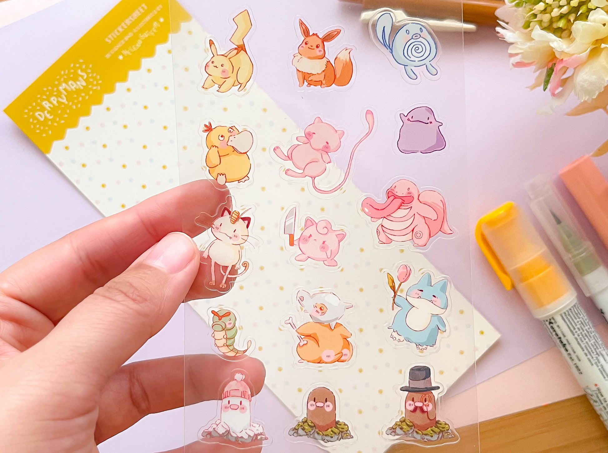 Derpy pokemans themed waterproof transparent sticker sheet with glossy finish.