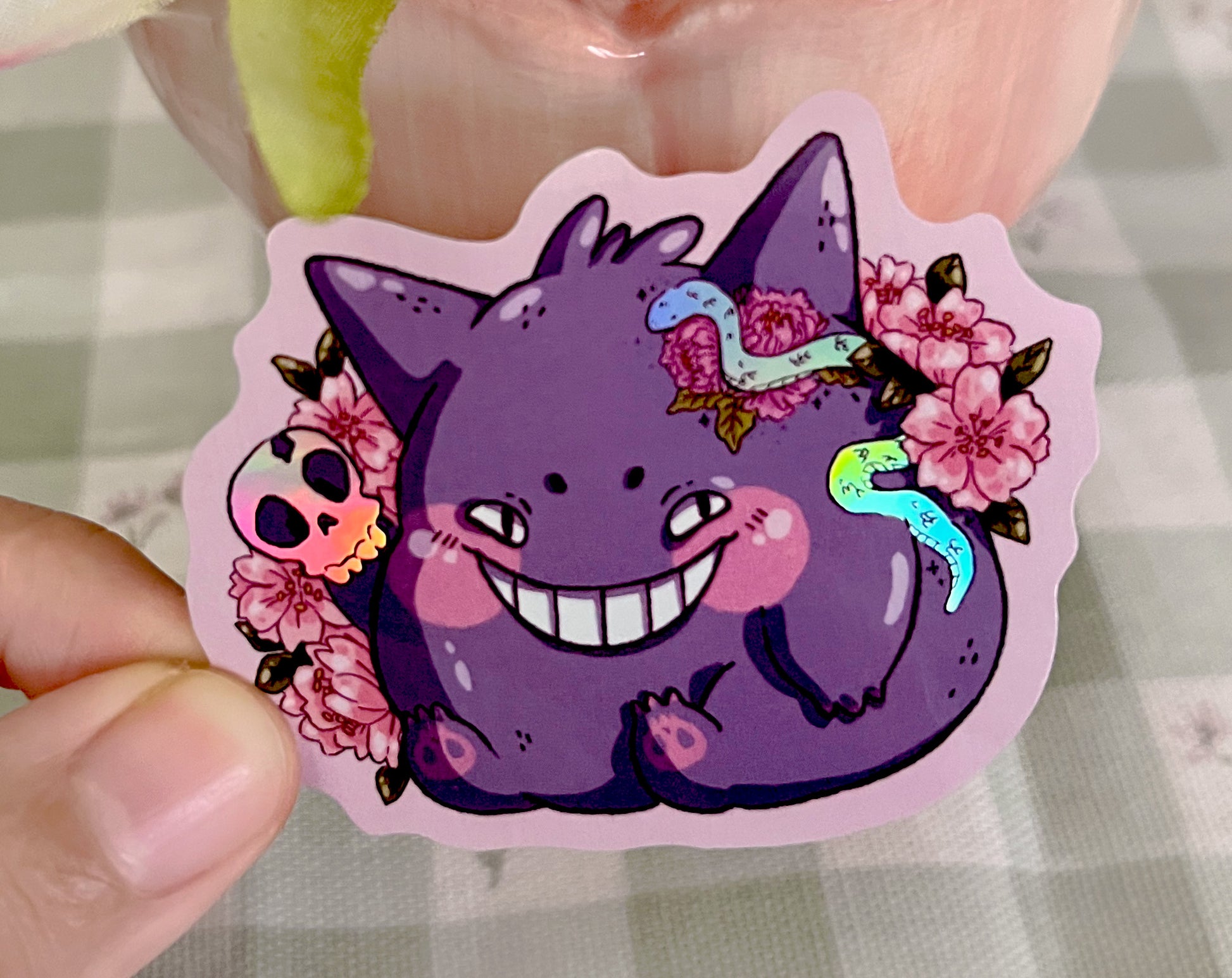 Waterproof & scratch resistant vinyl sticker with a holographic effect on skull and snake details and a glossy finish.
