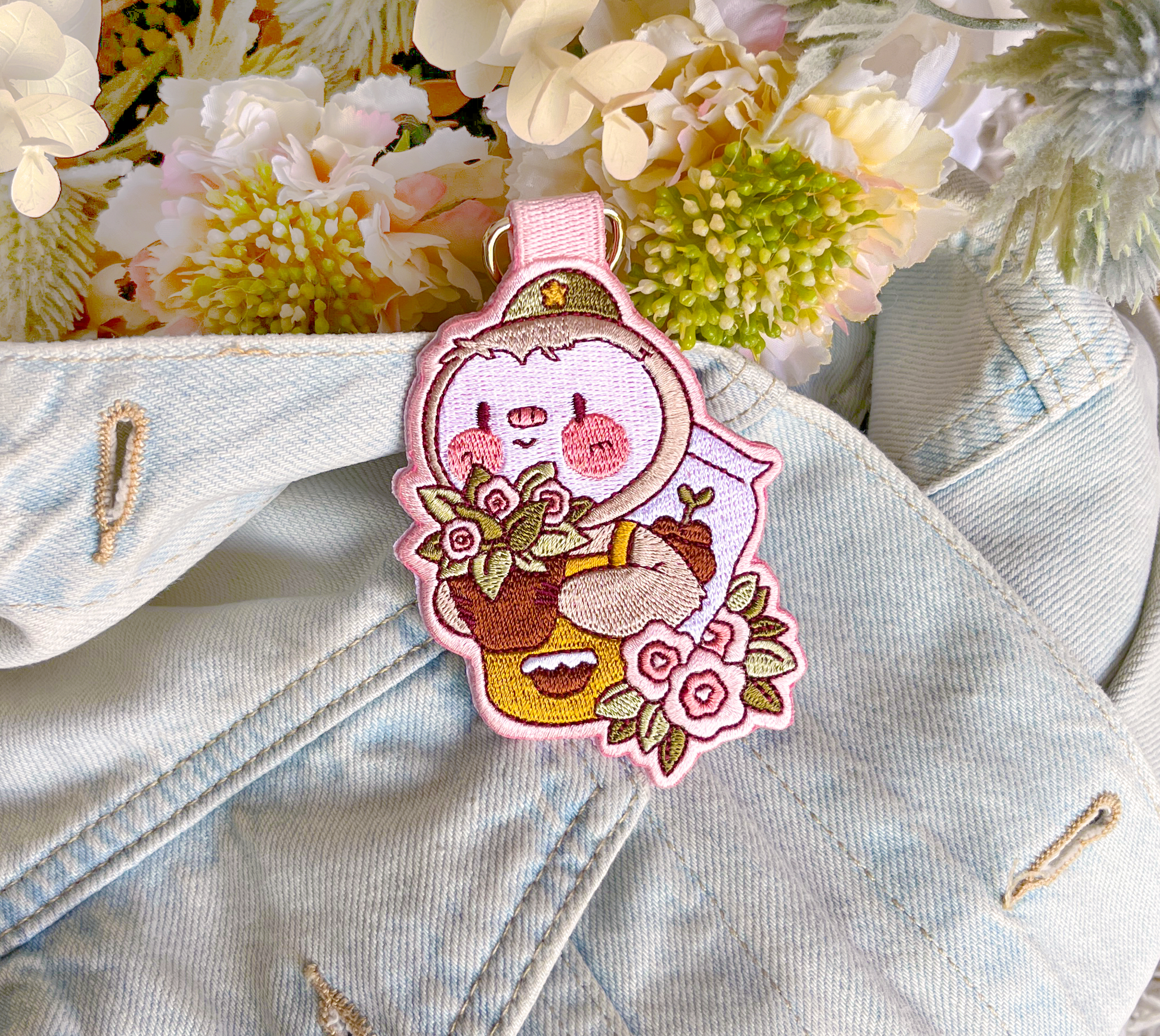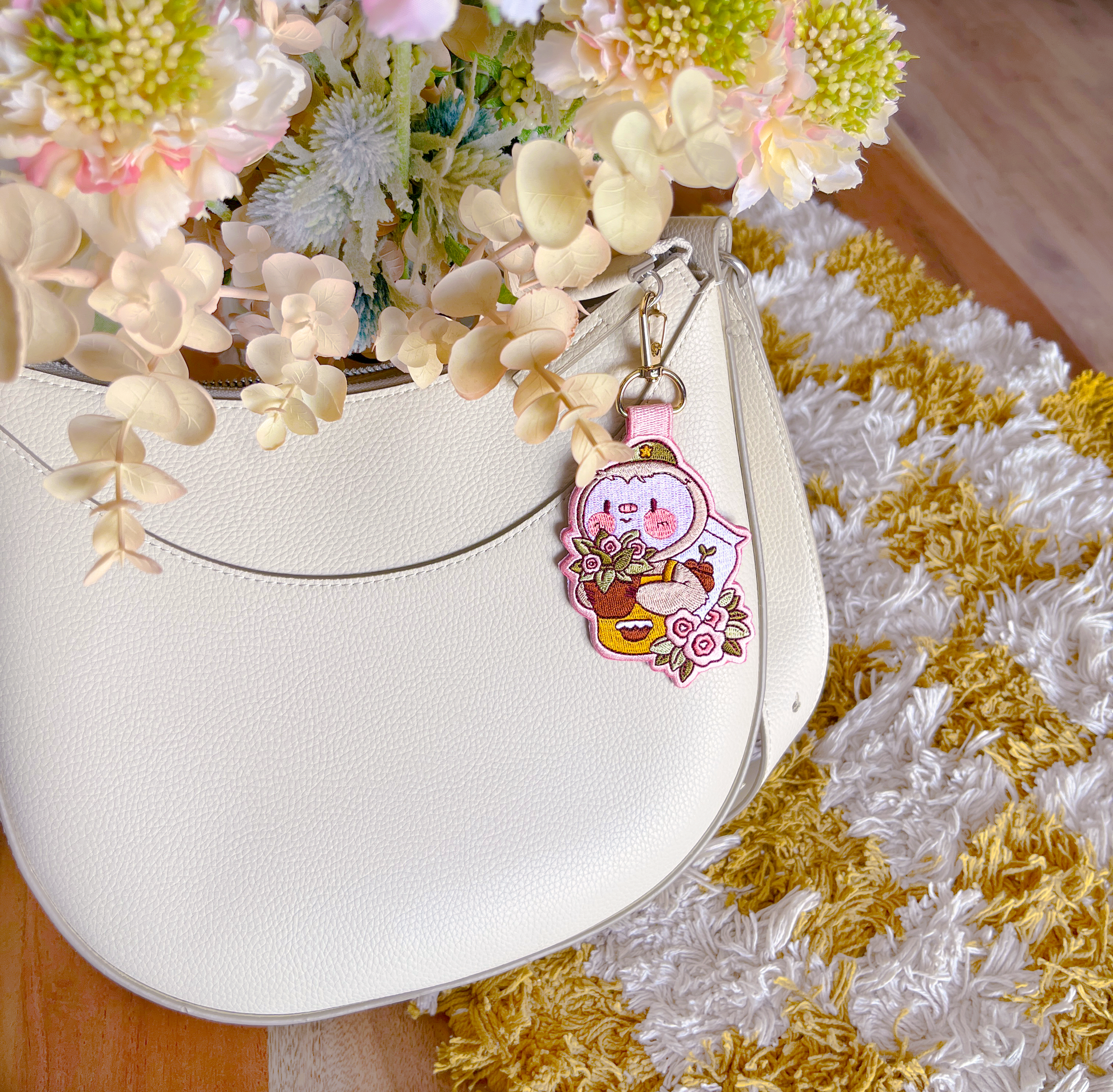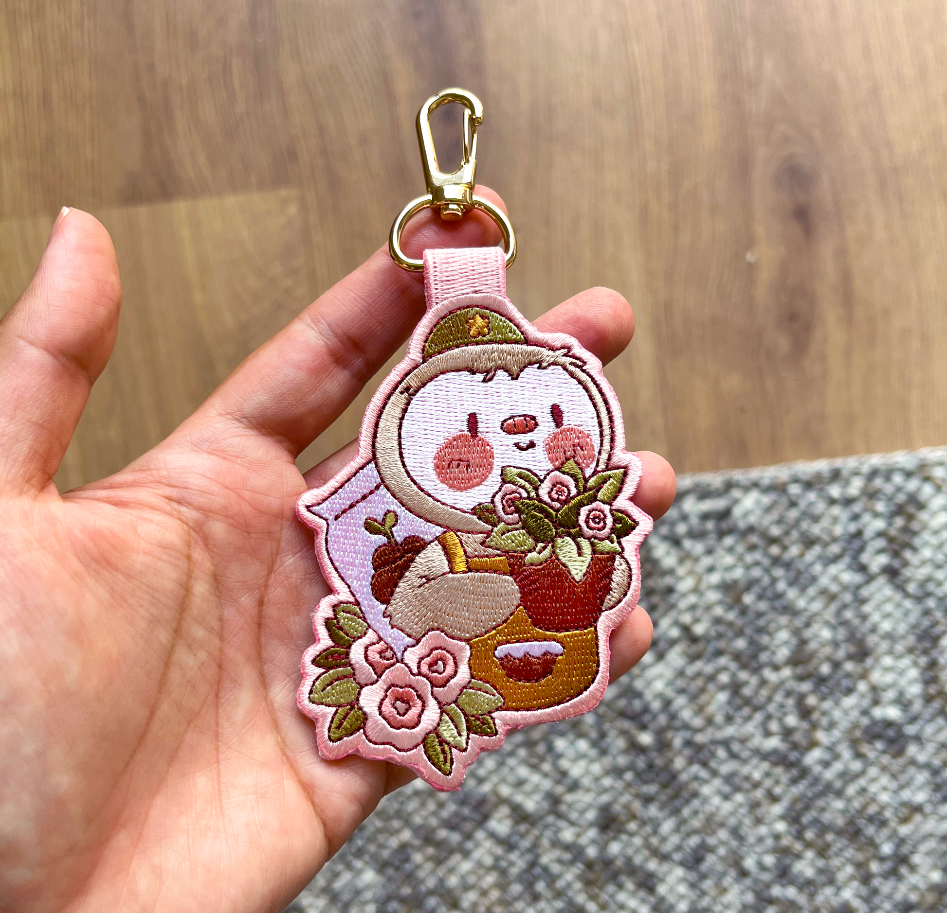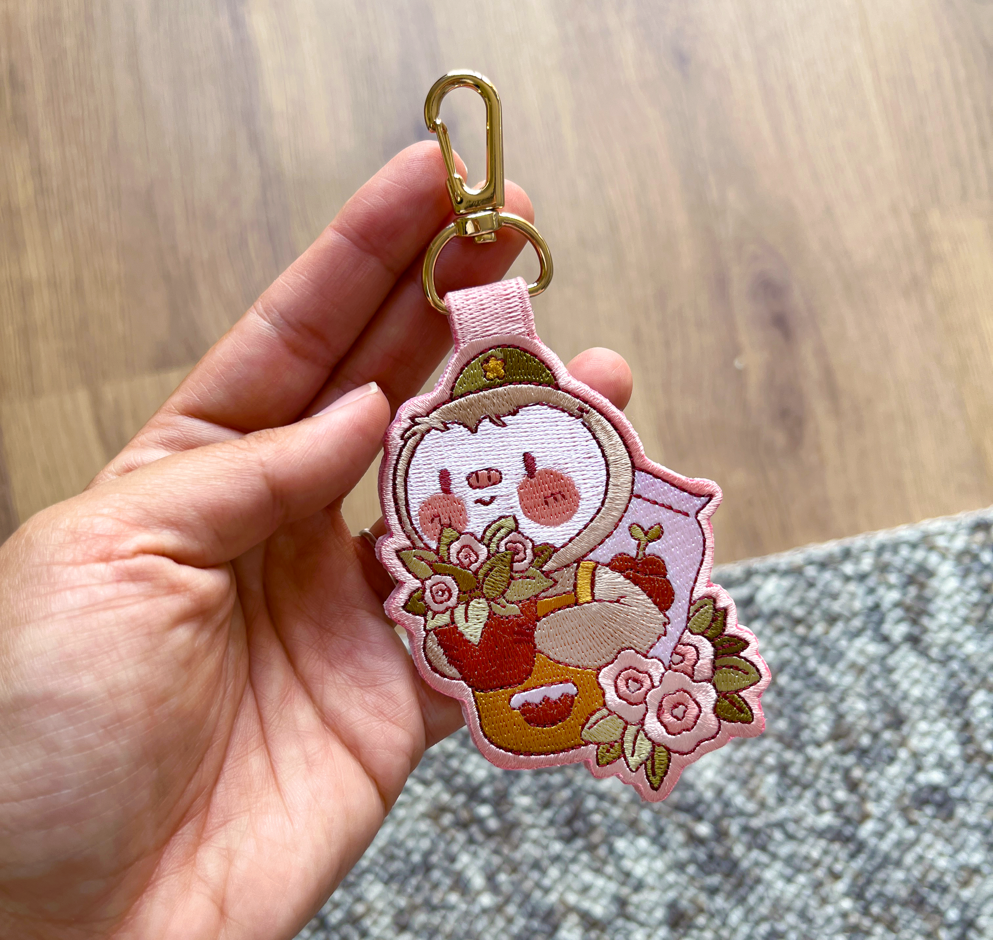 Double sided sloth Leif, from Animal Crossing, themed embroidered keychain. Each charm comes with a light gold hook shaped keychain, that opens with a tension clip hinge.