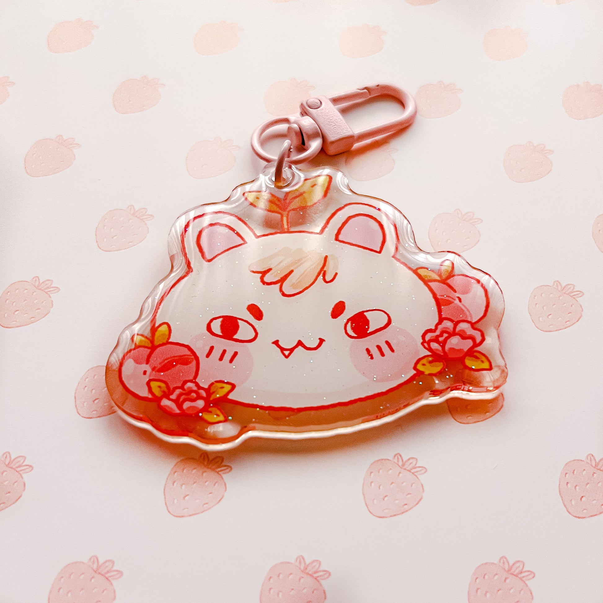 Double sided acrylic keychain. Each keychain comes with a light pink hook shaped fixing that opens with a tension clip hinge. The keychain also includes glitter and an epoxy coating on both sides.