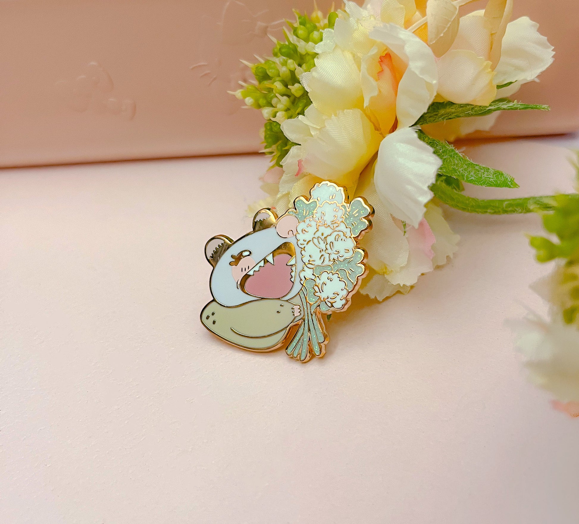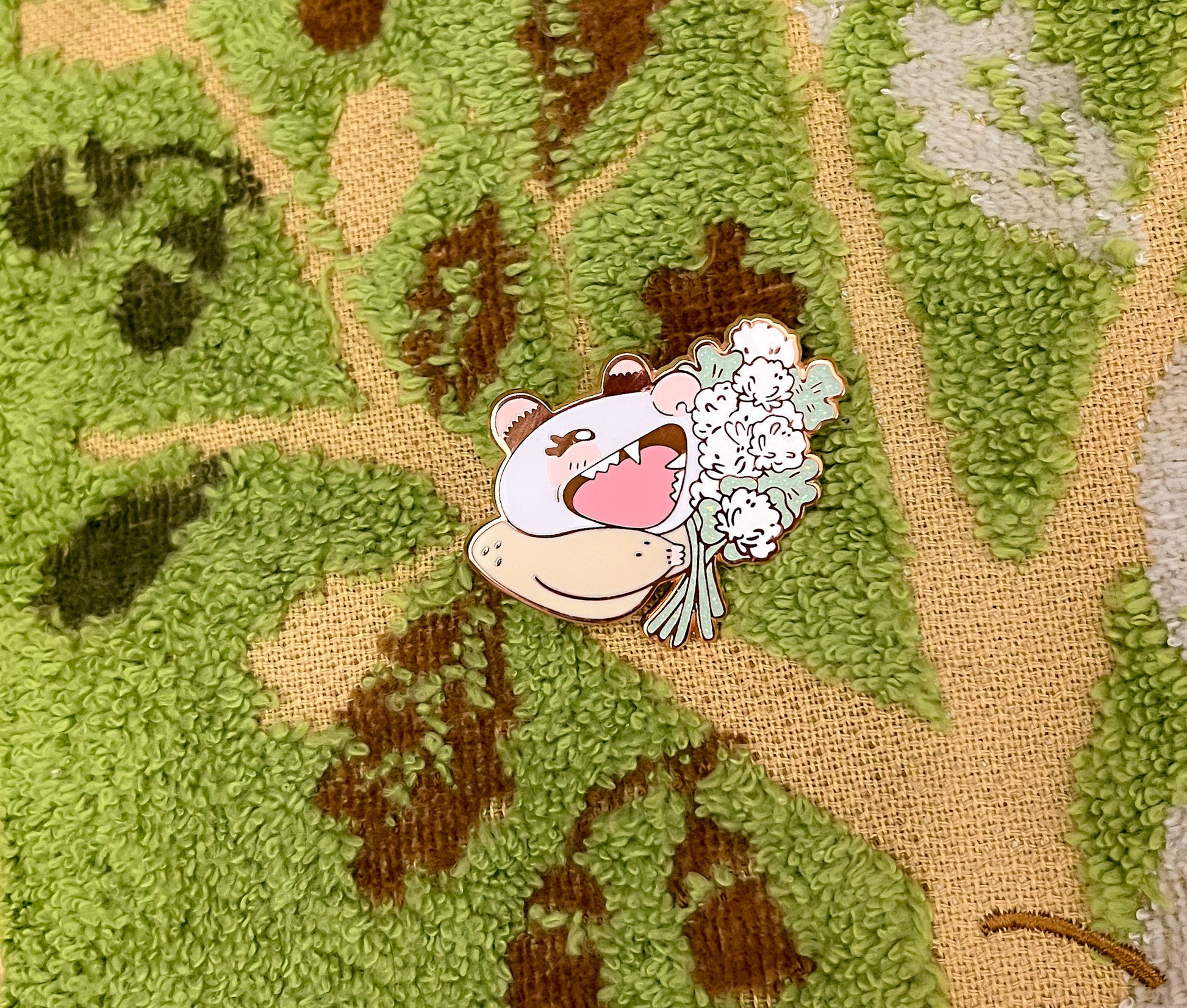 Cute enamel pin of possum Mayhem smiling beeeg and holding a bunch of clovers that are shiny with glitter mixed in the enamel.