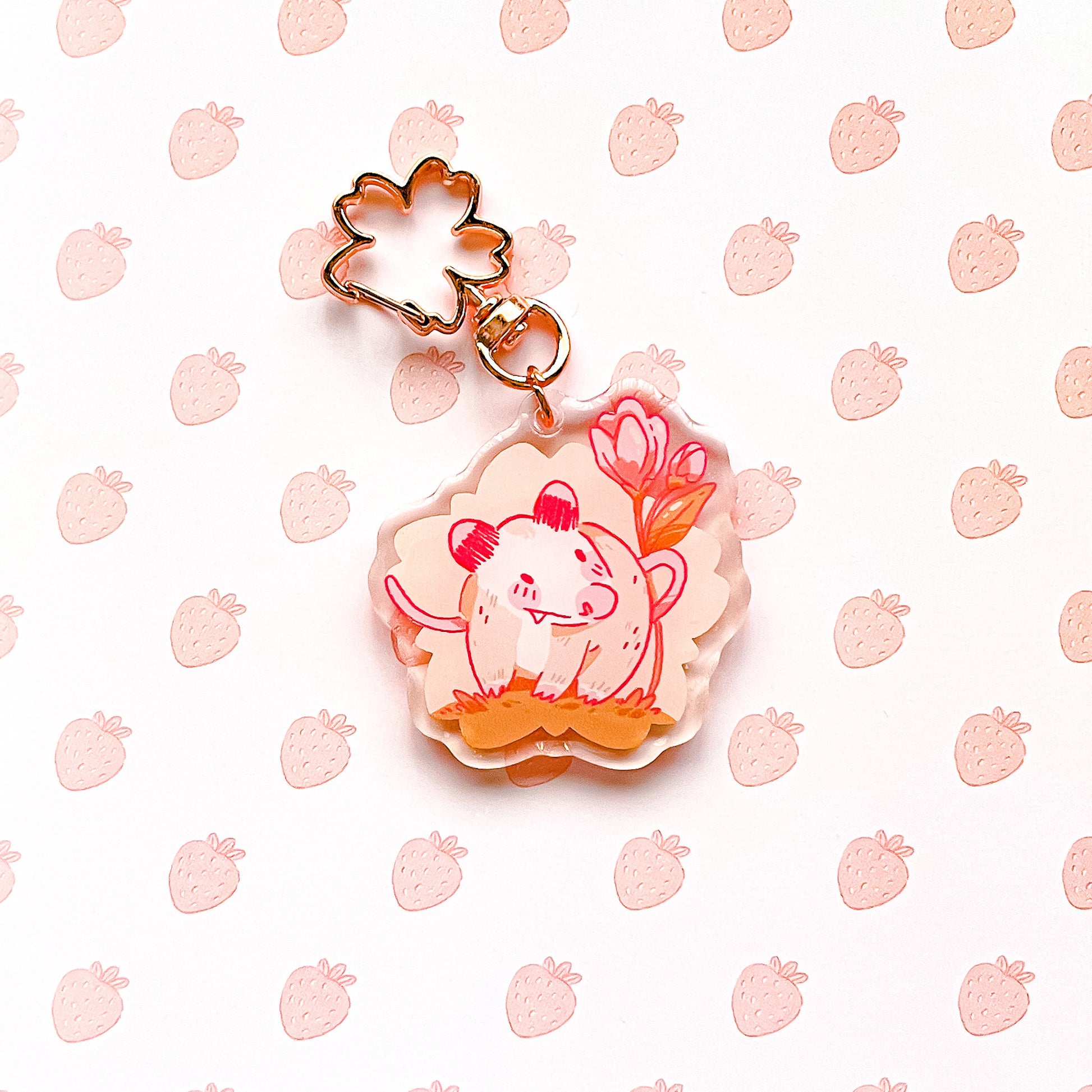 Double sided acrylic keychain. Each keychain comes with a soft gold sakura shaped fixing that opens with a tension clip hinge. The keychain also includes an epoxy coating on both sides.