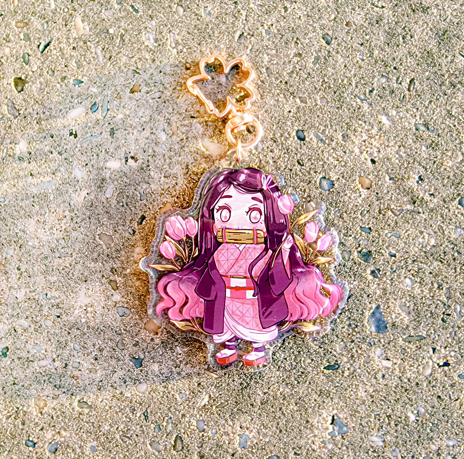Double sided acrylic keychain. Each keychain comes with a soft gold sakura shaped fixing that opens with a tension clip hinge. The keychain also includes an epoxy coating on both sides.