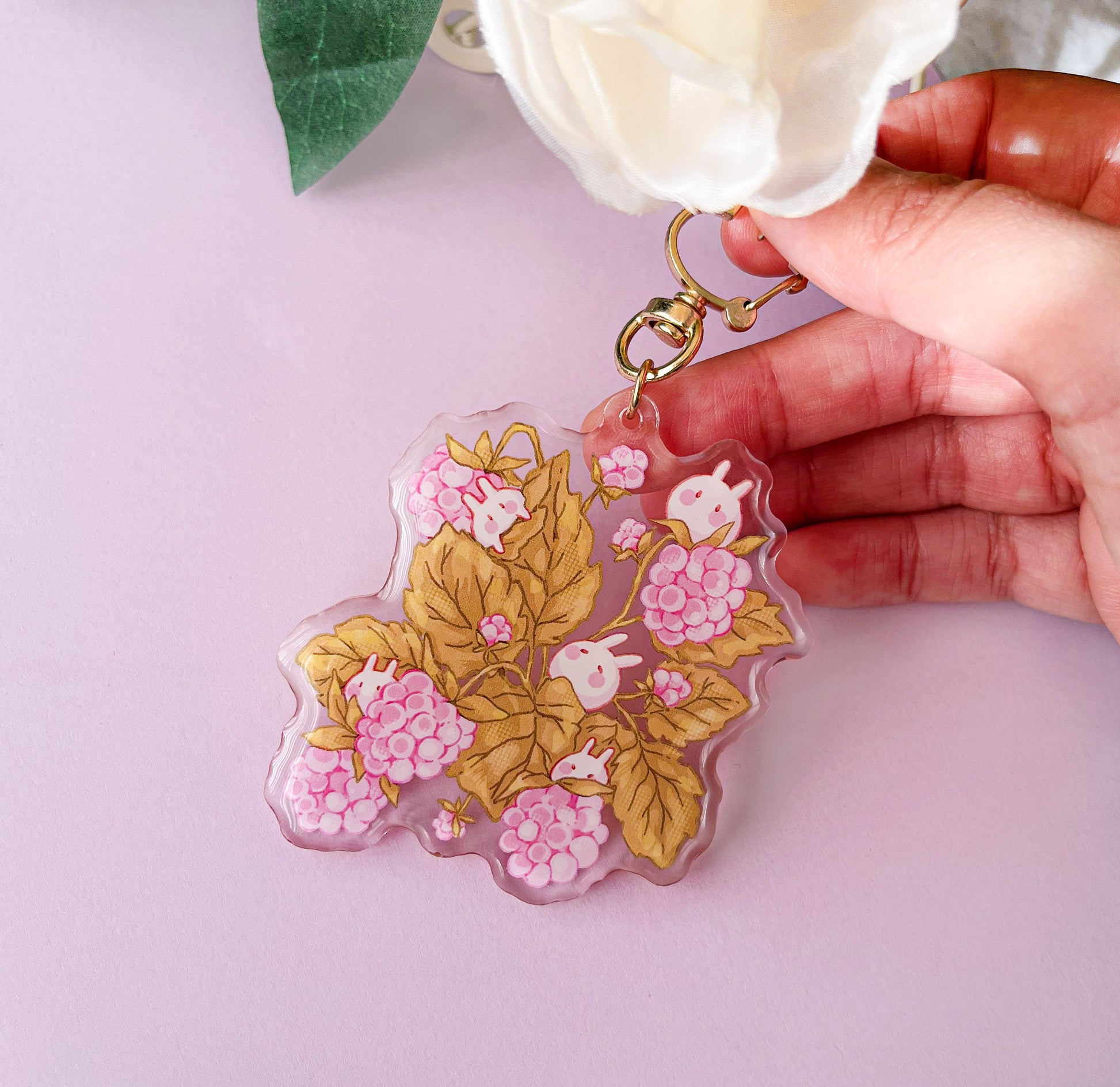 Double sided acrylic keychain. Each keychain comes with a soft gold bunny shaped fixing that opens with a tension clip hinge. The keychain also includes an epoxy coating on both sides.