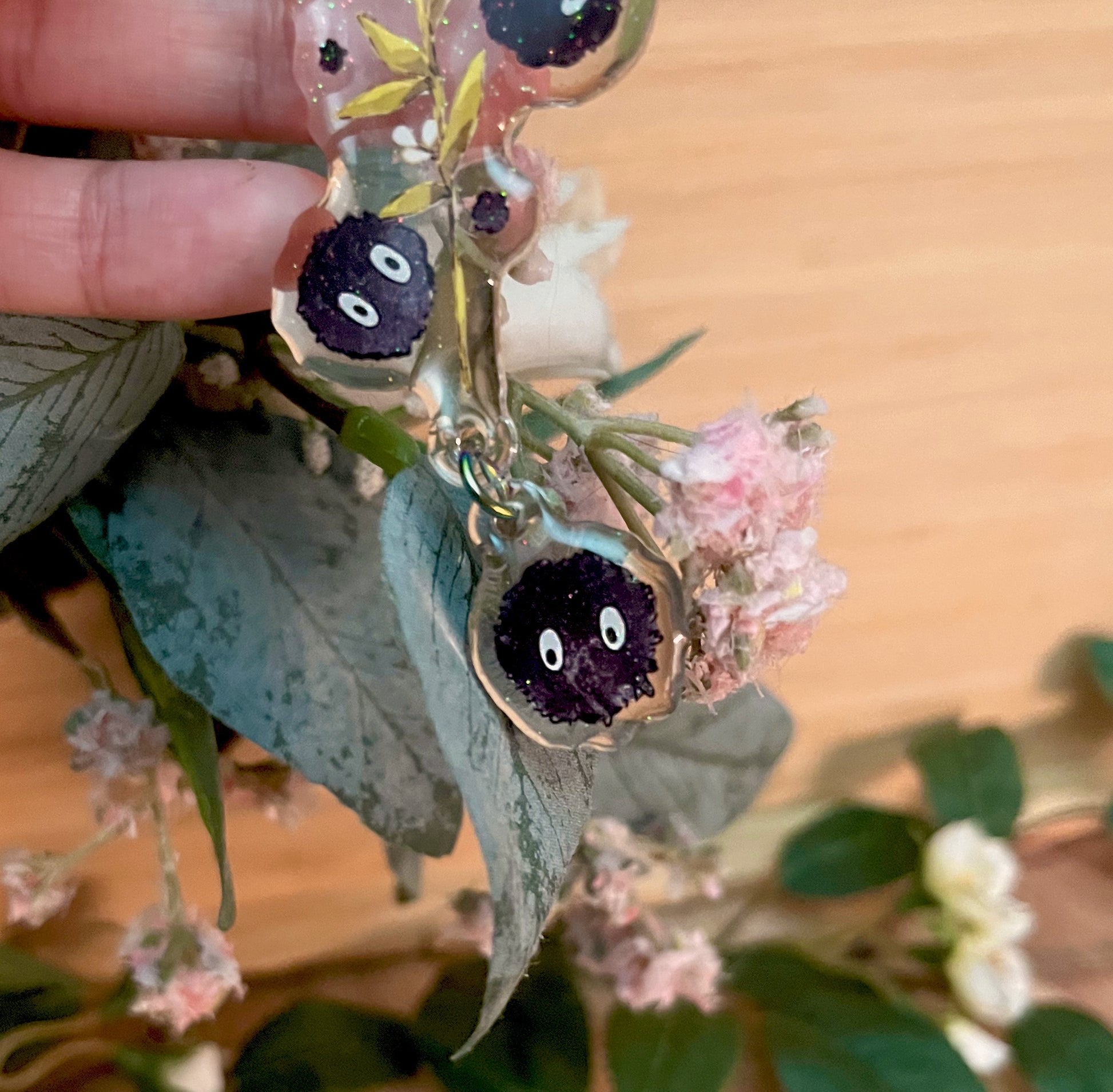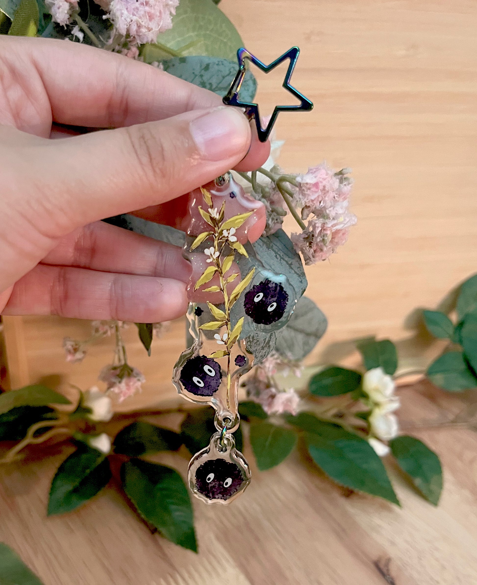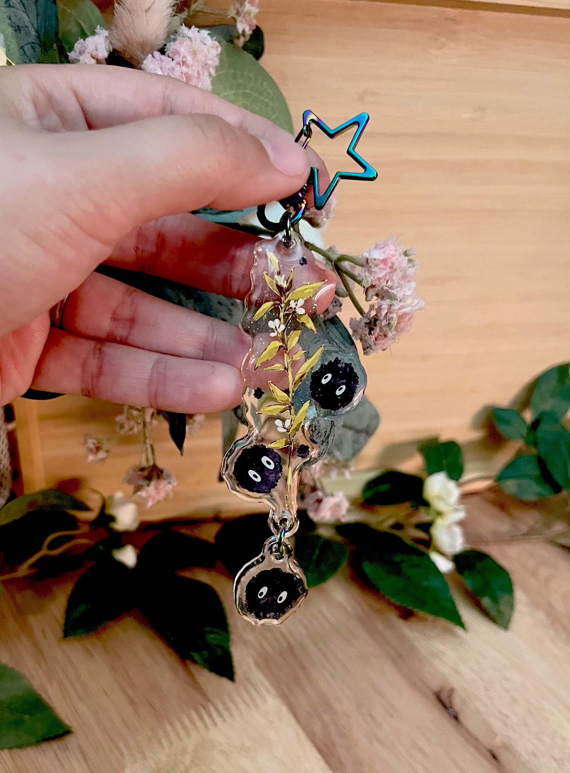 Double sided soot sprites acrylic dangly keychain. Each keychain comes with an iridescent star shaped fixing, that opens with a tension clip hinge, and an individual soot sprite dangler at the end. The keychain also includes a glitter effect as well as an epoxy coating on both sides.