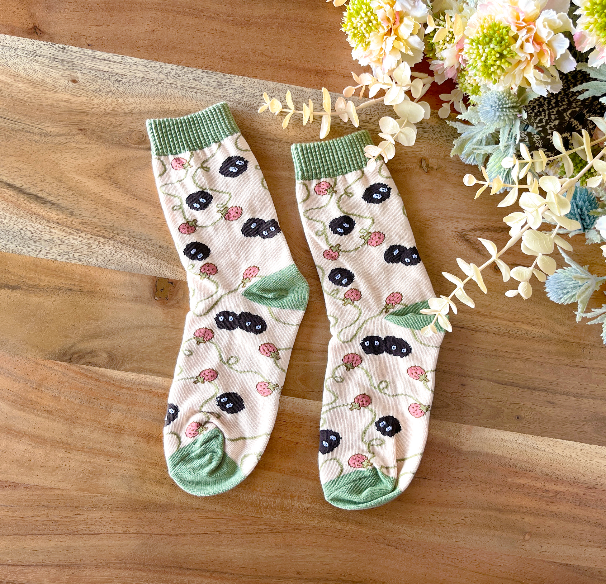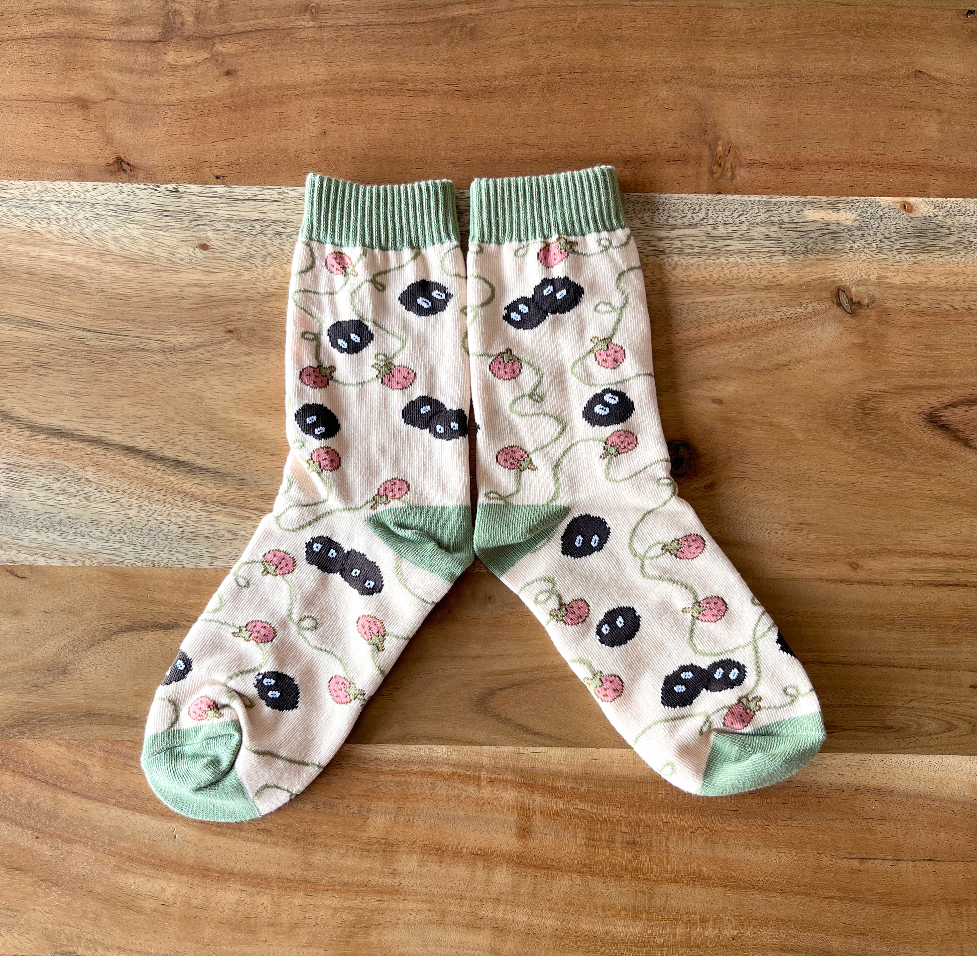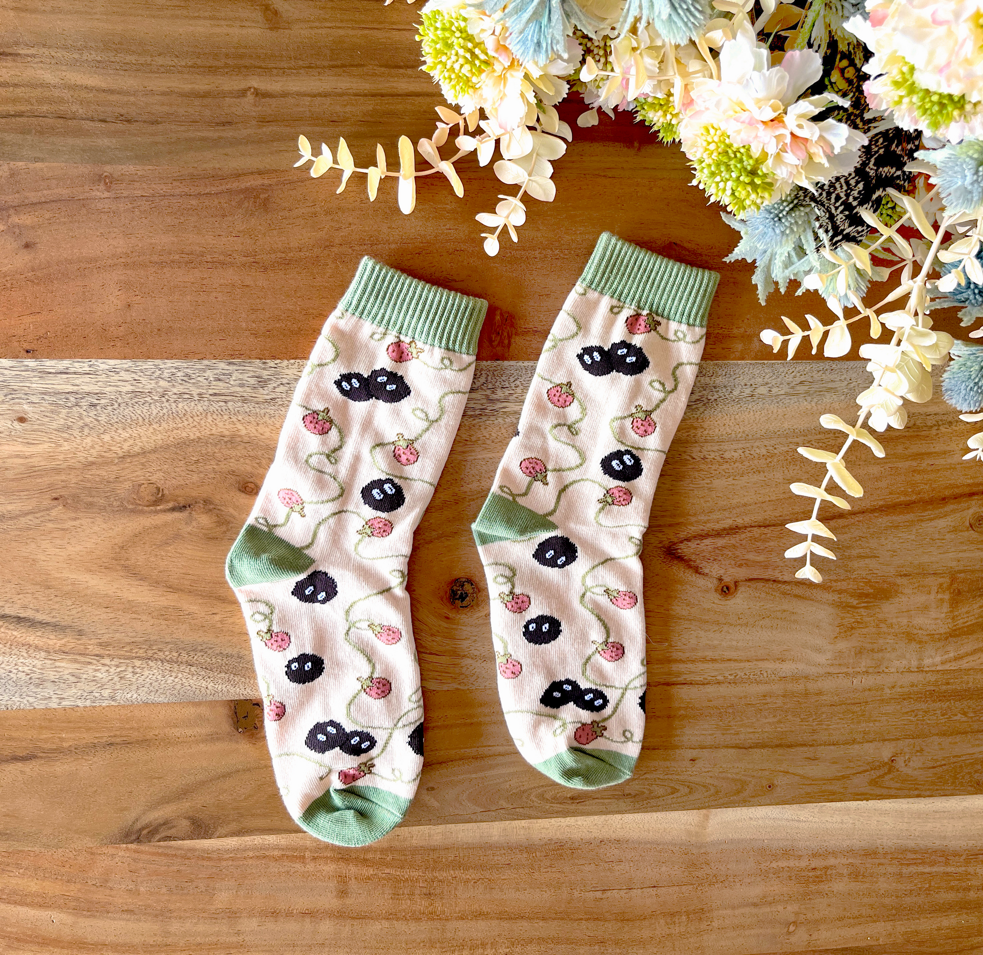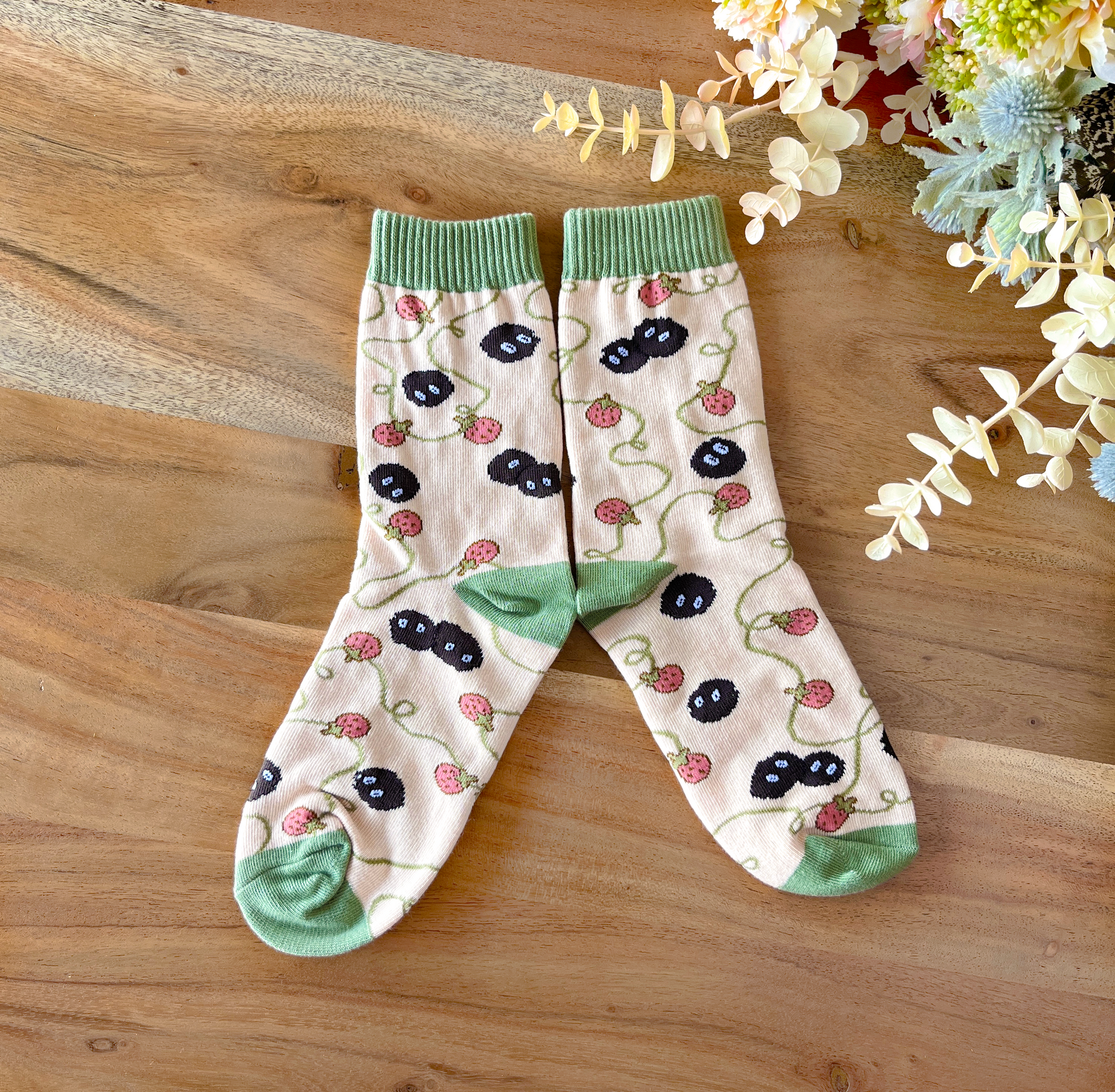 Fashionable comfy soot sprite themed socks with some sprinkled strawberries. Add a lil fun to your daily wardrobe with these socks and Ushi will protect your feetzes all day long ❤︎