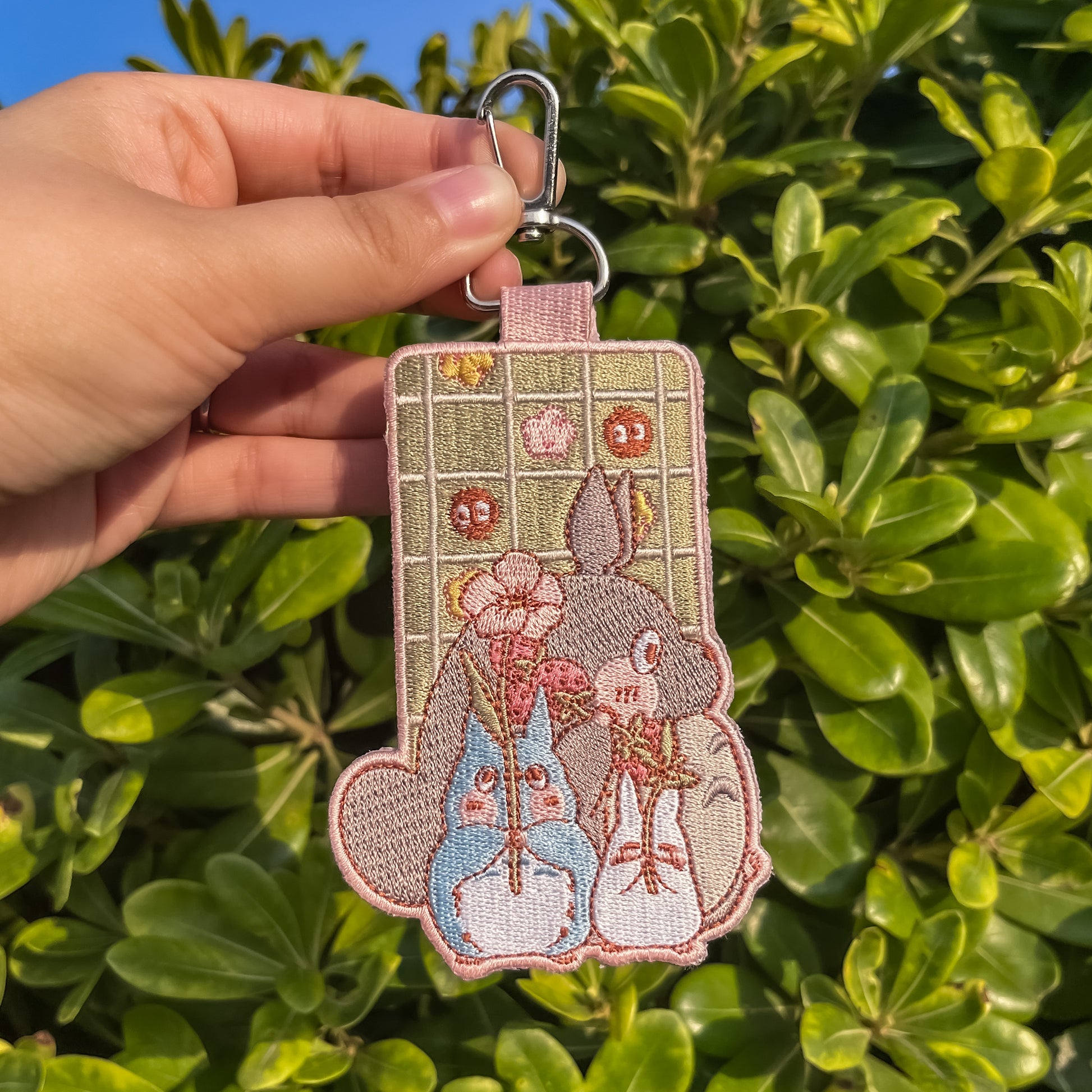 Double sided Totoro, from My Neighbor Totoro, themed embroidered keychain. Each charm comes with a silver hook shaped keychain, that opens with a tension clip hinge.