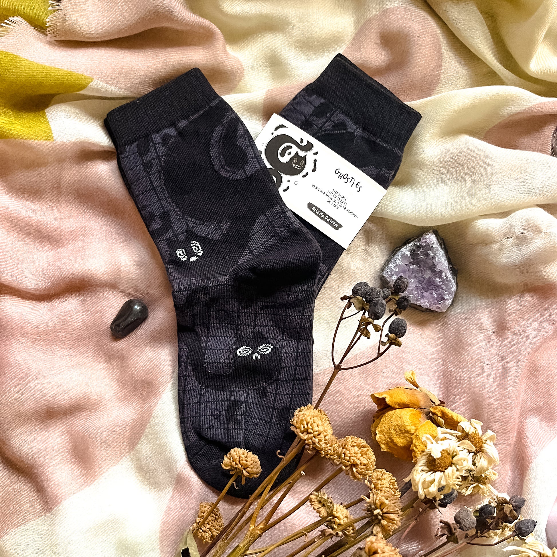 Fashionable comfy ghosty cats themed socks. Add a lil fun to your daily wardrobe with these socks and the ghosties will protect your feetzes all day long ❤︎